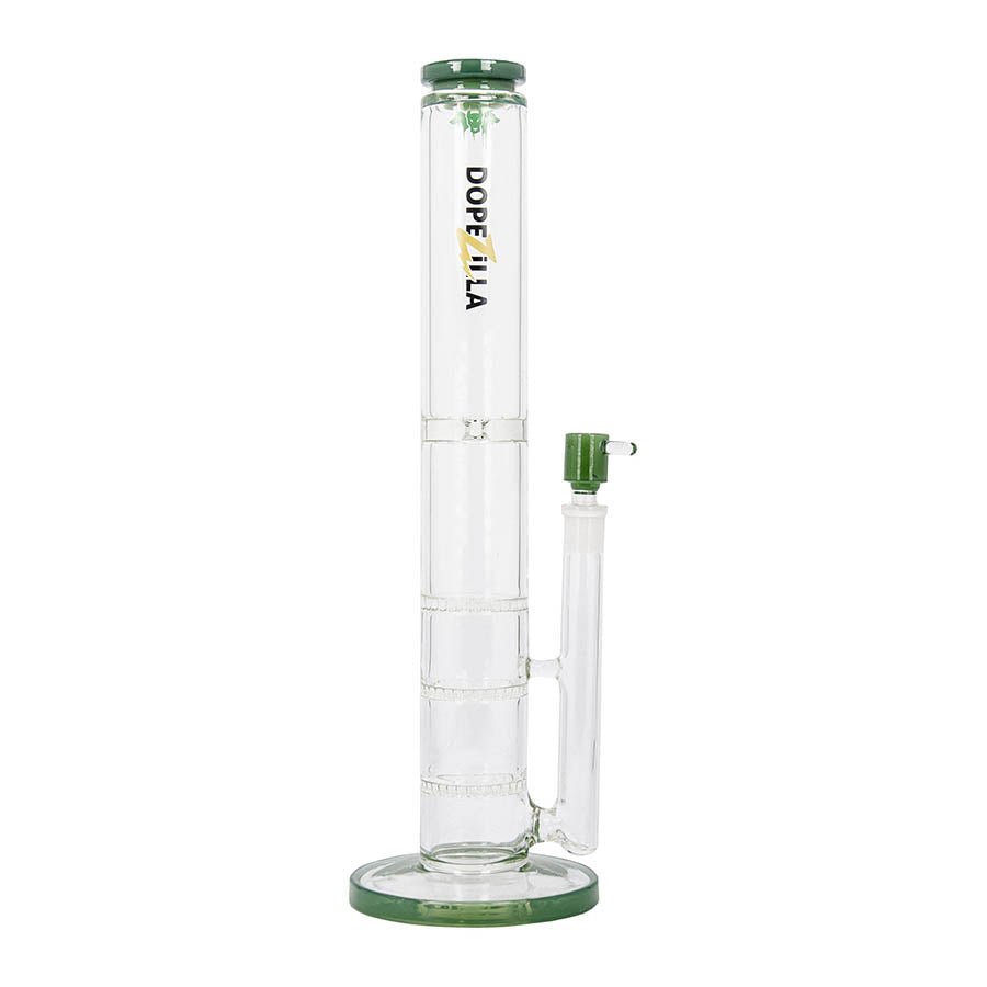 Part of this fun collection is Cerberus, a clear straight tube ice bong with a coloured accent on the bowl, base, mouthpiece and custom monster logo is extremely easy to clean and maintain. The honeycomb percolators makes the hit incredibly smooth. It features a bullet hole ice notch, for optimal filtration with a frosty touch.
